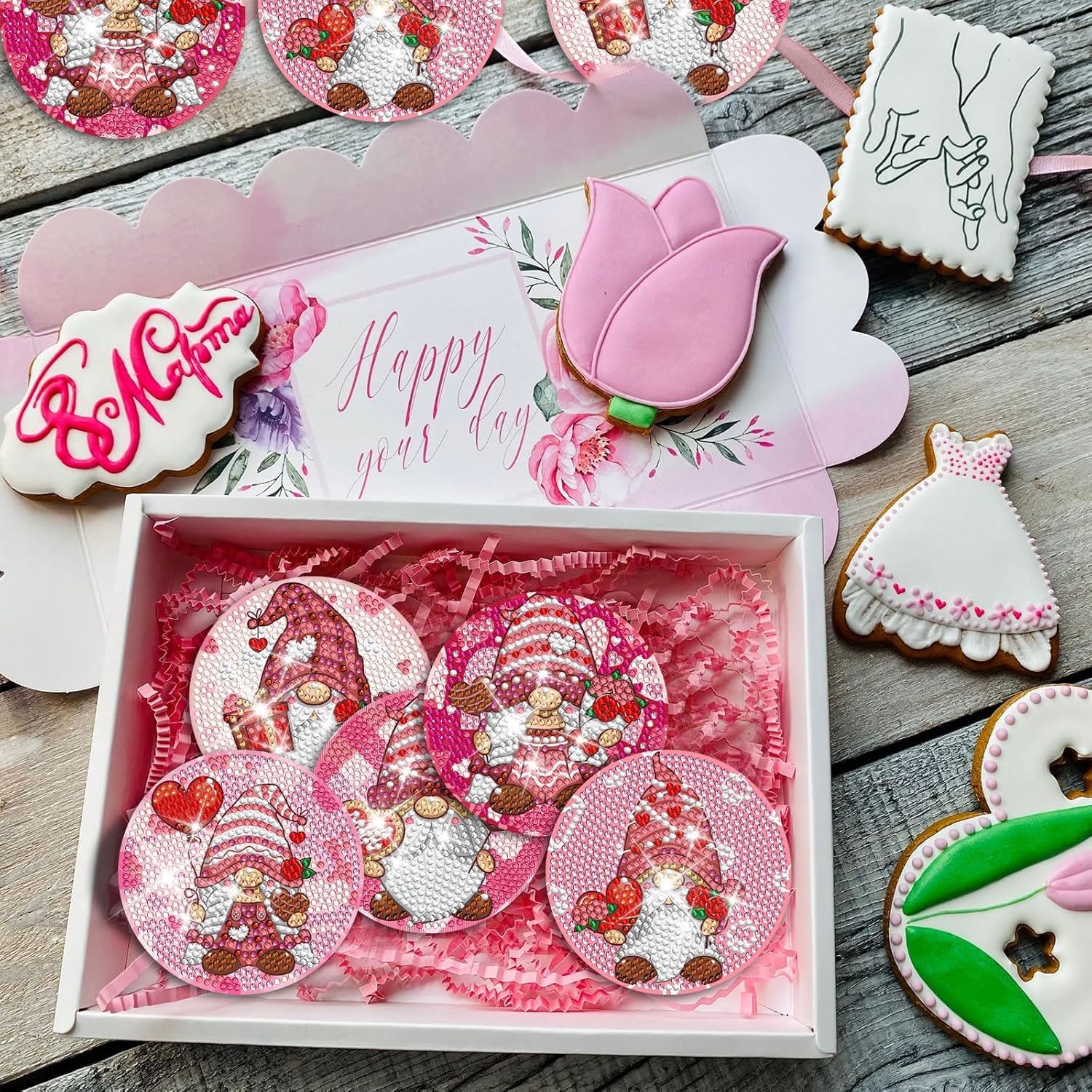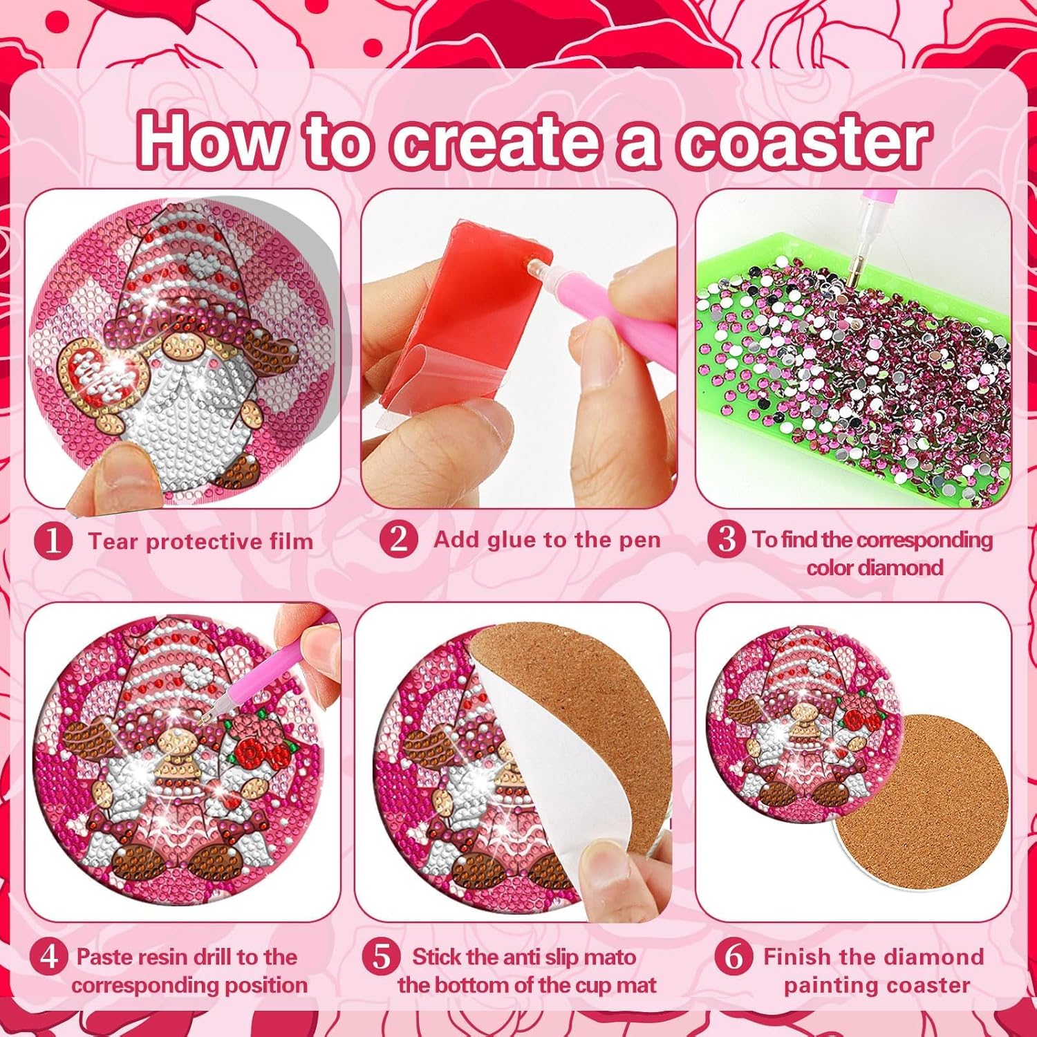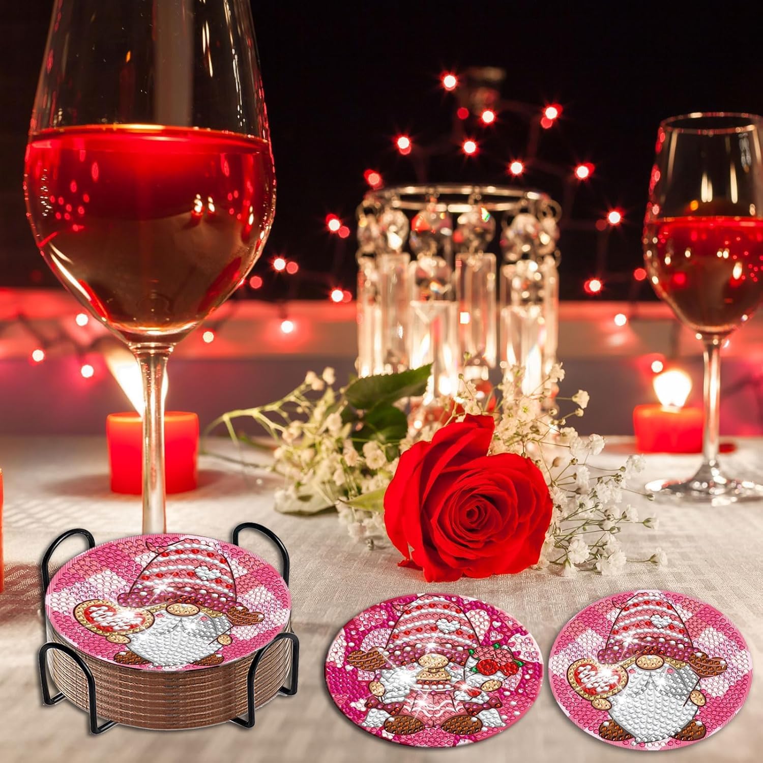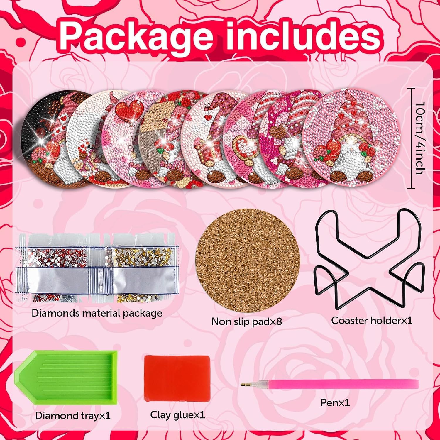 - Package Contents: You will receive 8 Valentine's Day gnome themed design art coasters,1 coaster holder, enough colorful diamonds, 1 clay adhesive, 1 pen and 1 diamond tray for your creative needs.